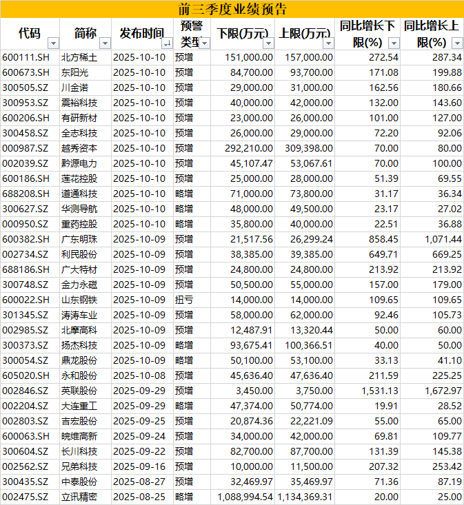仅10月10日晚间,就有北方稀土(600111)、东阳光(600673)、川金诺(300505)等12家公司发布了前三季度业绩预告。其中,北方稀土预计归属于上市公司股东的净利润为15.1亿~15.7亿元,同比增长272.54%~287.34%。