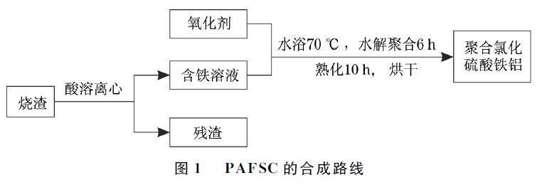 將一定量硫鐵礦燒渣置于三口燒瓶中,三端分別接溫度計(jì)、攪拌裝置和冷凝管.硫鐵礦燒渣經(jīng)高溫焙燒后,表面有一層致密的氧化膜,采用鹽酸和硫酸混酸酸溶。加入質(zhì)量分?jǐn)?shù)為20%的HCl和H2SO4,硫鐵礦燒渣與混酸酸溶的固液比為1∶2.5,水浴加熱90℃,攪拌速度為180r/min,反應(yīng)3h,燒渣中鐵的浸出率達(dá)85.3%.完全反應(yīng)后將反應(yīng)物轉(zhuǎn)入離心管中以10 000r/min離心3min.分離得到聚合反應(yīng)準(zhǔn)備液,聚合反應(yīng)準(zhǔn)備液進(jìn)行水解聚合合成PAFSC.使水解聚合反應(yīng)得以順利進(jìn)行的關(guān)鍵之處在于控制適宜的pH和鐵濃度.適宜的pH(質(zhì)量分?jǐn)?shù)為1%的水溶液pH為2~3)可以使鋁鐵不斷進(jìn)行水解反應(yīng)而不生成沉淀,鐵濃度的限定(Fe質(zhì)量分?jǐn)?shù)大于等于12%)是為了得到合格的絮凝劑產(chǎn)品和較好的絮凝性能.本實(shí)驗(yàn)硫鐵礦燒渣經(jīng)混酸酸溶,不需調(diào)節(jié)pH,同時(shí)保證了較高的鐵利用率.酸溶所得酸浸液Fe質(zhì)量分?jǐn)?shù)為14.56%,質(zhì)量分?jǐn)?shù)為1%的水溶液pH為2.16(GB14591—2006,聚合硫酸鐵,Fe質(zhì)量分?jǐn)?shù)大于等于11%,質(zhì)量分?jǐn)?shù)為1%的水溶液pH為2~3).液體加入三口燒瓶中,加入一定量的Al2O3(控制Al與Fe物質(zhì)的量比為1∶8),溫度為70℃,轉(zhuǎn)速為180r/min,加入一定量氯酸鈉作氧化劑(根據(jù)測(cè)定的Fe2+物質(zhì)的量的110%投加),水解聚合6h.反應(yīng)完全后,冷卻至室溫,熟化10h,得紅棕色液體.產(chǎn)品鹽基度檢測(cè)為11.3,Fe2+含量測(cè)定質(zhì)量分?jǐn)?shù)為0.02%(GB14591—2006,聚合硫酸鐵,鹽基度8~16,Fe2+質(zhì)量分?jǐn)?shù)小于等于0.1%),置于烘箱以105℃烘干,研磨成粉,備用.PAFSC的合成技術(shù)路線如圖1所示.
