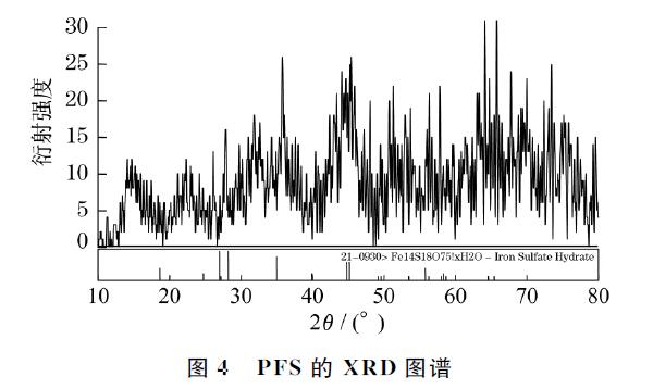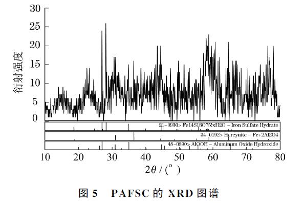 用XRD測(cè)定PFS和PAFSC的晶體結(jié)構(gòu),分別如圖4和圖5所示.由圖4和圖5可知,存在晶體峰疊加在較多非晶態(tài)的漫射峰上,這表明PAFSC與PFS均輕微的結(jié)晶化.同時(shí),PAFSC的峰與標(biāo)準(zhǔn)峰相比均有一定的偏移,這是由于晶格的收縮或膨脹引起的.XRD圖譜表明PFS和PAFSC中均含有硫酸鐵鹽,同時(shí),由于Al 3+的引入,合成的PAFSC并未顯著改變結(jié)構(gòu),但生成了像鐵鋁尖晶石和羥基氧化鋁(圖5)等新的物相.