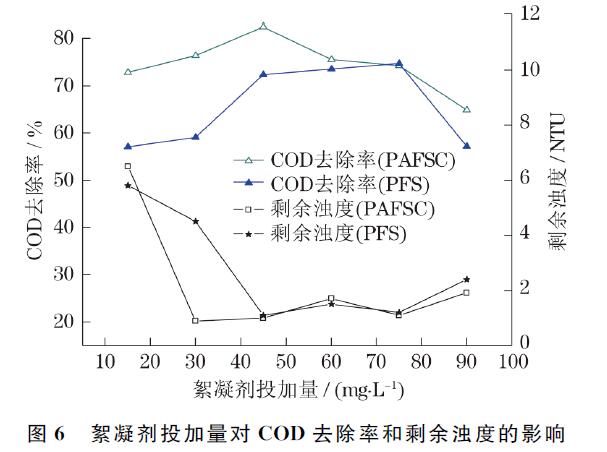 c.PAFSC在投加量為45mg/L時(shí),COD和濁度去除率分別能達(dá)到82.4%和99%.相比PFS,合成的PAFSC具有更加高效穩(wěn)定的絮凝性能.復(fù)合絮凝劑的性能相較傳統(tǒng)絮凝劑更好,利用硫鐵礦燒渣的研究可致力于引入較高價(jià)態(tài)的陰離子來合成新型復(fù)合絮凝劑。