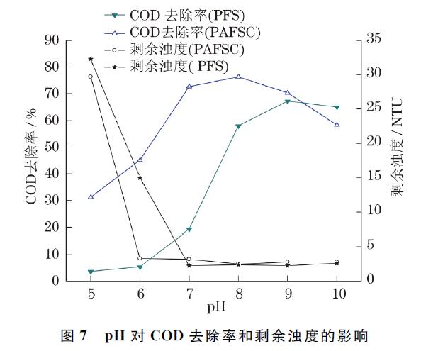 經(jīng)SEM,XRD和FTIR等方法表征,探究了PAFSC的結(jié)構(gòu)和形態(tài),PAFSC主要是羥基與鋁鐵橋連的聚合鐵鋁混合物.進(jìn)一步探究PAFSC的絮凝性能,采用PAFSC和PFS處理生活廢水,在不同投加劑量以及不同pH條件下,測(cè)定其COD及濁度的去除率,對(duì)PAFSC的絮凝性能進(jìn)行評(píng)價(jià).不同的PAFSC投加量對(duì)COD以及濁度的去除率如圖6所示.其中,隨著PAFSC和PFS投加量不斷變大,剩余濁度先由大變小再變大.PAFSC的投加量由15mg/L至45mg/L,COD的去除率和剩余濁度分別不斷增大和減小.投加量達(dá)到45mg/L時(shí),繼續(xù)投加絮凝劑,絮凝性能有所下降,這有可能是由絮凝劑電中和作用和吸附架橋兩種機(jī)制引起的.由于水體中帶有大量負(fù)電荷,膠體顆粒由于電荷的同性相斥而趨向形成一個(gè)分散穩(wěn)定的體系,加入帶有大量陽離子的PAFSC絮凝劑后,膠體表面的負(fù)電荷逐漸被中和而導(dǎo)致膠體顆粒脫穩(wěn),從而不斷凝聚絮凝和沉淀.但隨著加入的絮凝劑過量后,由于絮凝劑本身的特性,形成的絮體表面重新帶電而出現(xiàn)了再穩(wěn)定現(xiàn)象.而絮凝過程中的吸附架橋作用,投加量較低時(shí),絮凝劑難以形成足夠多的架橋連接各個(gè)膠體顆粒.但投加過量時(shí),缺少足夠多未被吸附的顆粒不斷連接在長鏈狀的橋上,同時(shí)顆粒變得更不穩(wěn)定.綜上所述,較佳絮凝反應(yīng)存在一個(gè)較適宜的絮凝劑投加量.絮凝實(shí)驗(yàn)結(jié)果表明,PAFSC相比PFS有著更優(yōu)異的絮凝性能,在投加量為45mg/L時(shí),COD去除率為82.4%,剩余濁度為1NTU(濁度去除率達(dá)99%).這可能是PAFSC相比于PFS,由于鋁的添加使得鐵鹽和鋁鹽不斷水解互相交聯(lián)、共聚,從而形成具有多核、更長、更穩(wěn)定的高分子聚合長鏈提升吸附架橋能力;同時(shí),由于氯離子的引入,使鋁鐵共聚物的分子量和穩(wěn)定性得到一定的提升,也使多核共聚物的電荷量有所提高而促進(jìn)了電中和作用.在使用絮凝劑處理廢水的絮凝過程中,污水的pH對(duì)絮凝效果影響較大.測(cè)定pH在5~10的范圍內(nèi),投加相同劑量的PAFSC和PFS,測(cè)定其COD的去除率及剩余濁度,結(jié)果如圖7所示.由圖7可知,pH在5~8時(shí),PAFSC和PFS處理廢水時(shí)COD去除率不斷增大.這主要是因?yàn)樵谳^低的pH條件下,溶液中陽離子過多抑制絮凝劑的水解.但隨著pH的增大,溶液中的羥基與絮凝劑會(huì)進(jìn)一步反應(yīng),使得絮凝劑中未反應(yīng)或未完全反應(yīng)的鋁鐵進(jìn)一步聚合,從而增強(qiáng)其吸附架橋的能力.同時(shí),膠體的表面電荷因電中和作用電荷量不斷降低,促使懸浮物脫穩(wěn)不斷絮凝.然而,在更高的堿性環(huán)境中,絮凝劑會(huì)受到水中過多的OH-與本身所帶正電荷的電中和作用的影響,導(dǎo)致所帶電荷量減小,抑制絮凝過程中的電中和作用[22].此外,PAFSC在較寬的pH范圍內(nèi)處理效果均高于PFS,且在pH較小時(shí),COD去除明顯優(yōu)于PFS.PAFSC相對(duì)于PFS,當(dāng)pH在7~9時(shí),能達(dá)到較佳的處理效果,應(yīng)用范圍更廣,絮凝性能也更加穩(wěn)定,PAFSC和PFS對(duì)濁度的去除隨著pH的增大先急劇減小后逐漸穩(wěn)定.但PAFSC與PFS對(duì)比,PAFSC在pH較低的廢水中有較好的濁度去除效果.