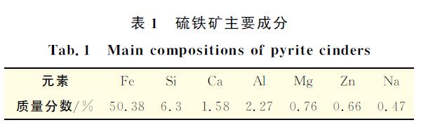 原料取自于安徽某硫酸廠的硫鐵礦燒渣,在105℃的烘箱干燥2h,經(jīng)球磨機(jī)研磨后過75μm孔徑篩分,放入恒溫干燥器中裝袋備用.硫鐵礦燒渣進(jìn)行消解,并對(duì)酸溶液稀釋后,采用ICP-OES測(cè)定樣品中多種元素含量。