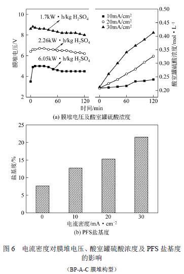 電流密度對膜堆電壓和酸室罐硫酸濃度的影 響(BP-A 膜堆構型)如圖5(a)所示,首先,膜堆電 壓隨著電流密度的增加而上升,說明大部分電能用 來克服由電流密度增加而增加的膜堆電阻[15-16];其 次,能耗隨著電流密度的增加而降低;較后,隨著 電流密度從10mA/cm2 增加到30mA/cm2,酸室中的 較終硫酸濃度從0.27mol/L 升高到0.42mol/L,原因 在于電流密度增加導致雙很膜發生水解離的驅動 力增加,此外,硫酸濃度的增加程度與電流密 度的增加程度不成比例,原因在于氫離子透過陰離 子交換膜發生泄漏,且電流密度越高、泄漏越 嚴重。電流密度對PFS 鹽基度的影響如圖5(b)所 示,電流密度從0 增加到30mA/cm2,鹽基度從7.68% 增加到20.13%,提高程度很顯著。主要原因在于電 流密度增大,雙很膜產生的OH–量越多,更多的OH- 參與水解反應,從而增加鹽基度。